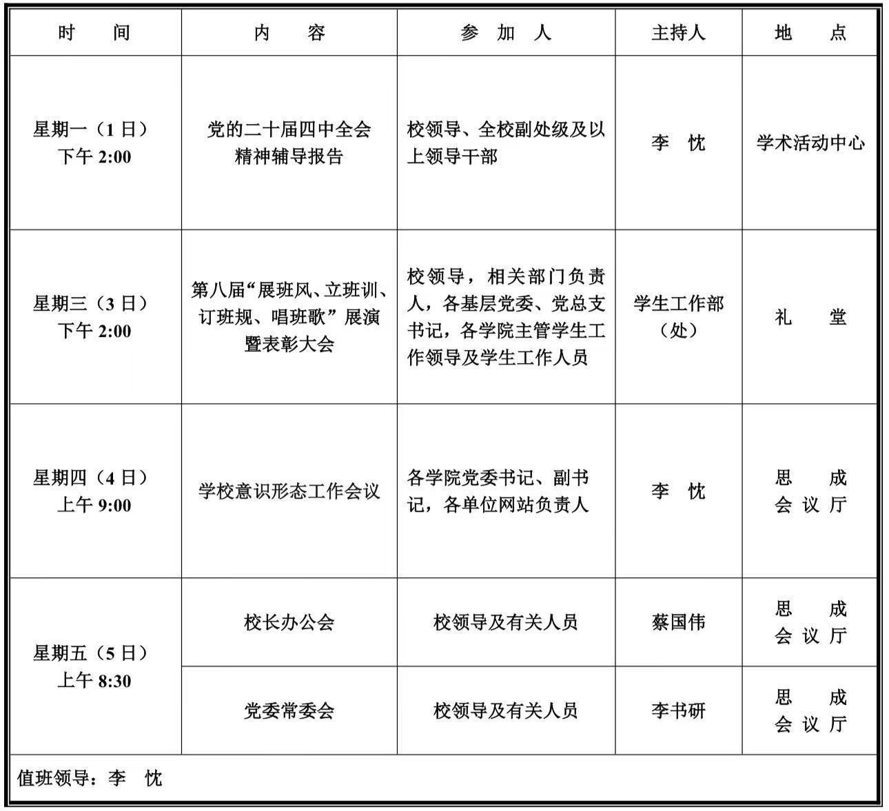 第十五周学校活动安排